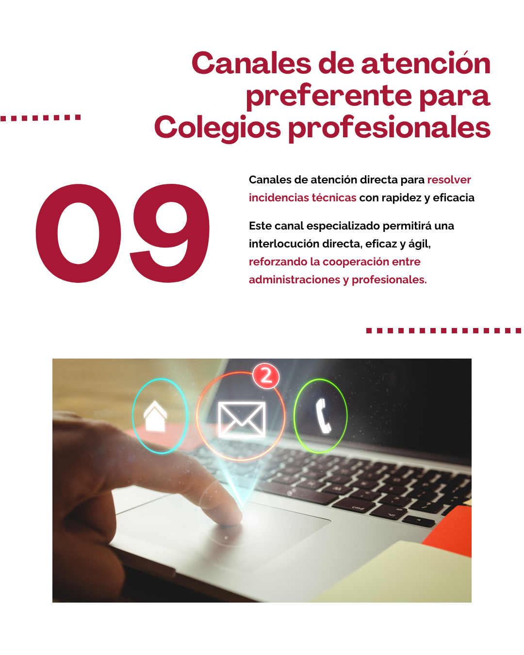 Se establecerán canales específicos y preferentes de atención a Colegios profesionales y entidades colegiadas con capacidad de representación, con el objetivo de resolver con la mayor celeridad las incidencias técnicas o consultas operativas que puedan surgir en relación con la gestión de las notificaciones electrónicas. Este canal especializado permitirá una interlocución directa, eficaz y ágil, reforzando la cooperación entre administraciones y profesionales.