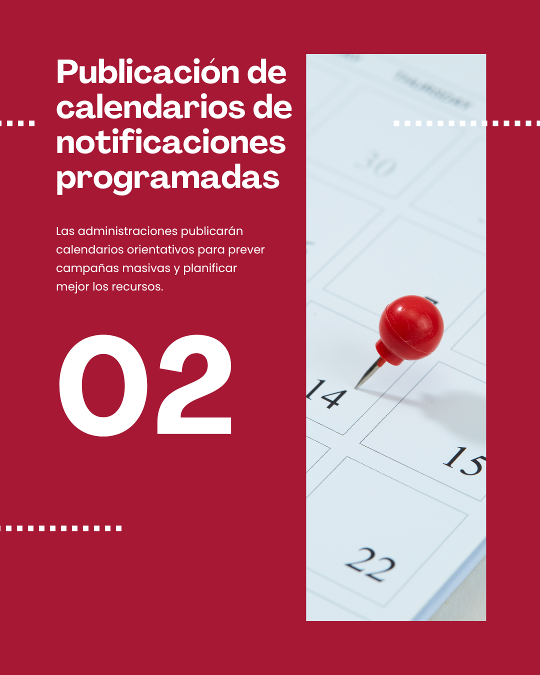Con el fin de facilitar una adecuada planificación de recursos y garantizar una gestión más eficiente y ordenada de las cargas de trabajo, las administraciones públicas establecerán y harán públicos calendarios orientativos de emisión de notificaciones asociadas a campañas masivas o actuaciones administrativas previstas. Esta previsión permitirá a los colectivos profesionales anticipar la recepción y tratamiento de un volumen elevado de comunicaciones y garantizar una atención de calidad a la ciudadanía.