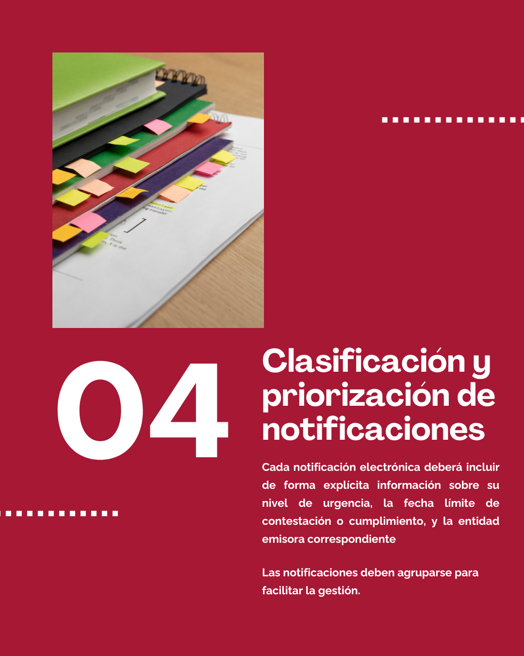 Cada notificación electrónica deberá incluir de forma explícita información sobre su nivel de urgencia, la fecha límite de contestación o cumplimiento, y la entidad emisora correspondiente. Asimismo, en caso de que un mismo sujeto reciba varias notificaciones procedentes de una misma administración, estas deberán agruparse o presentarse de forma ordenada para facilitar su gestión y evitar la dispersión documental. Cuando la recepción de notificaciones se canalice a través de un representante o apoderado, se deberán habilitar mecanismos que permitan su clasificación por representado, dotando al sistema de herramientas que favorezcan la eficiencia en la gestión multicliente.