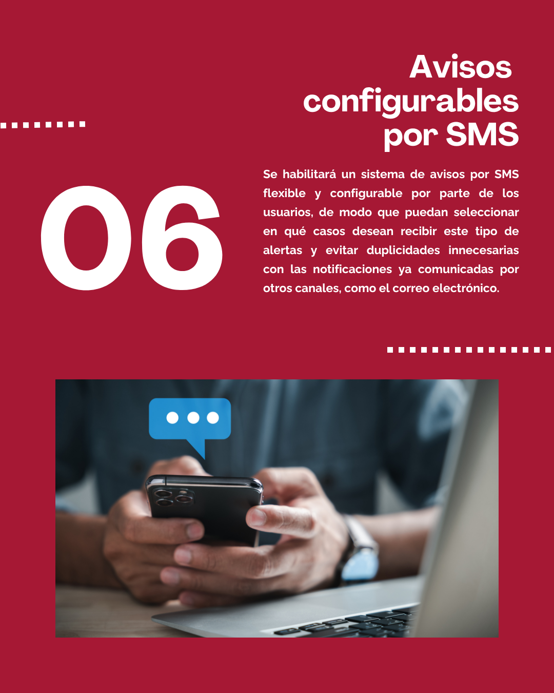 Se habilitará un sistema de avisos por SMS flexible y configurable por parte de los usuarios, de modo que puedan seleccionar en qué casos desean recibir este tipo de alertas y evitar duplicidades innecesarias con las notificaciones ya comunicadas por otros canales, como el correo electrónico. En el caso de los profesionales, este sistema debe permitir una gestión centralizada y ordenada que evite saturaciones y contribuya a una recepción más efectiva de las comunicaciones relevantes.