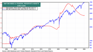 La relación entre los mercados financieros y la política monetaria es total desde hace décadas. Los incrementos de oferta monetaria, reflejados en la expansión del tamaño del balance de la Fed, se han traducido en subidas de los mercados bursátiles, concretamente, del S&P 500 como índice más capitalizado del mundo. ¿Quién está dispuesto a poner el ‘cascabel al gato’ y provocar un mercado bajista a base de reducir el balance de la Fed? En 4 años de política monetaria restrictiva, el tamaño del balance se ha reducido aproximadamente en 1/3.