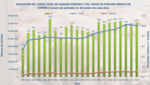 Gráfico 4: Evolución del ganado porcino y del porcino ibérico (1993-2023)